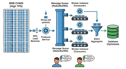 - Producer: Chỉ làm một việc duy nhất là fetch block và đẩy raw transaction vào hàng đợi (Redis/SQS). Việc này cực nhanh. Để tiết kiệm băng thông và tránh limit message size mình có zip message lại trước khi gửi đi. Thời gian zip chắc nhắn nhanh hơn để gửi raw.